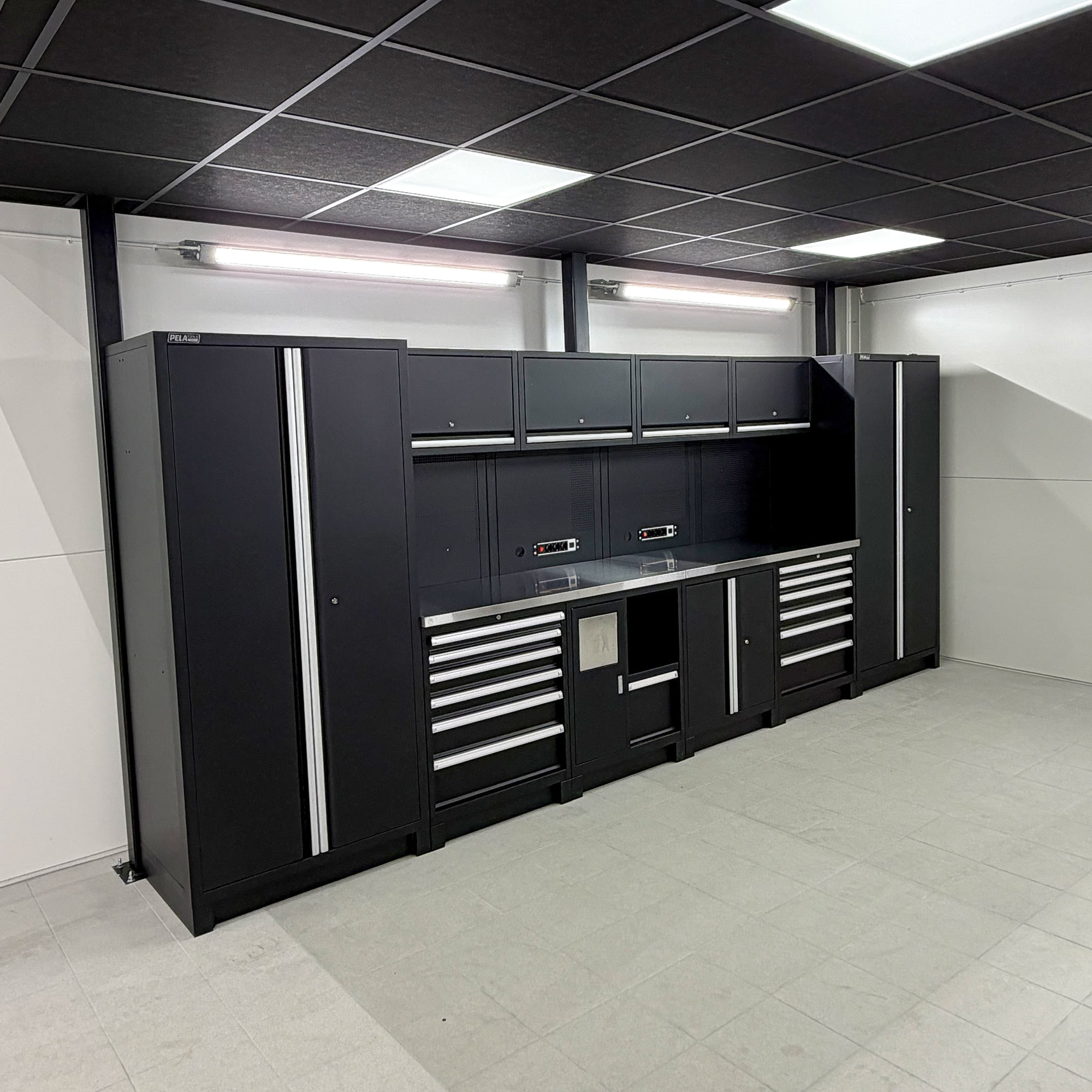 Pulverlackerad svart verkstadsinredning som blir totalt 4.7 meter bred och 2 meter hög. Rymmer otrolig mängd verktyg.