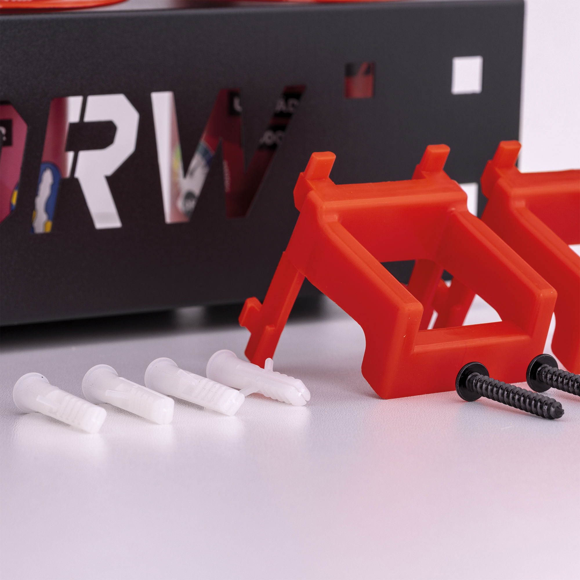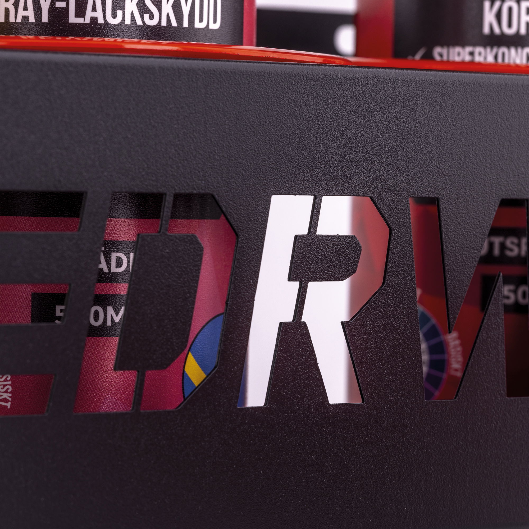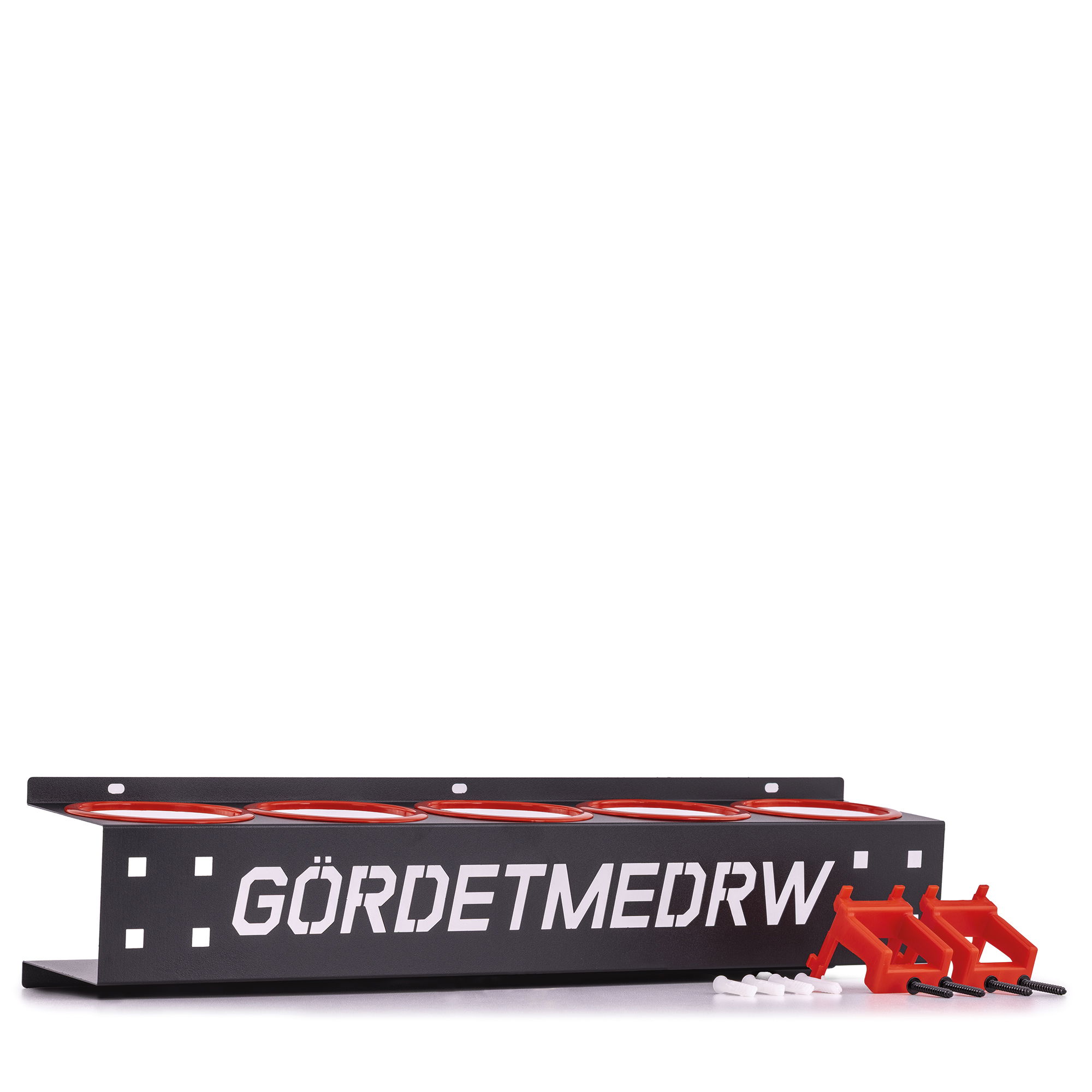 Tillverkad i rejäl plåt, pulverlackerad med laser-utskuren Gördetmedrw logotyp.